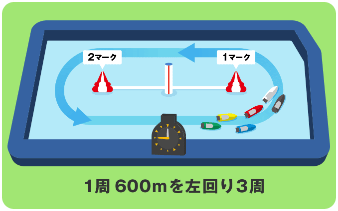 レースはスタート後、1マーク、2マークの順番に、左回りにコースを3周して順位を決めます。