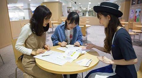 場内やレースのことがわからない3人は、1階インフォメーションで初心者ツアーを申し込むことに。ここではハマナ娘クルーが、ボートレースの基本から舟券の買い方、オッズの見方までやさしくガイドしてくれるので、初めてでも安心ですね。※浜名湖本場開催日のみ