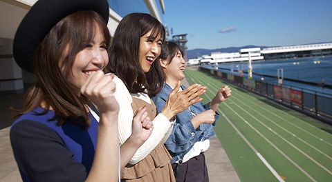 浜名湖にはいろいろな観覧席が用意されているのでお好みの席で観戦できます。3人が向かったのは、有料指定席ロイヤルルーム。グループでもゆっくりレースを楽しむことができる、広々としたスペースです。3階最上階とあって見晴らしも抜群!水面でのダイナミックなレースをバッチリ観戦できますよ。